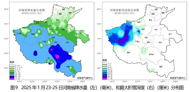 1月下旬河南省出现2次大范围雨雪天气,尤其是1月23—25日,河南省出现2024/2025年冬季首场大范围明显雨雪天气,中西部大到暴雪,部分县市大暴雪、局部特大暴雪;黄河以南中到大雨、局部暴雨。全省26站次日降水量突破建站以来1月历史极值;嵩县1月25日最大积雪深度达24厘米,突破建站以来历史极值。该过程影响范围广、累计雨雪量大、积雪深度深、气温下降剧烈,对土壤增墒蓄墒效果显著,有效降低森林火险等级,但对交通运输造成一定不利影响。