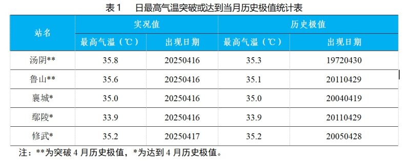 4月16—17日,河南省出现高温天气,豫北及中西部大部最高气温达33℃以上,其中安阳、焦作、济源、洛阳、郑州、开封、平顶山等地部分县(市)日最高气温超过35℃。16日,汤阴和鲁山2个国家级气象站日最高气温突破4月历史极值,襄城和鄢陵达到4月历史极值;17日,修武国家级气象站日最高气温达到4月历史极值。