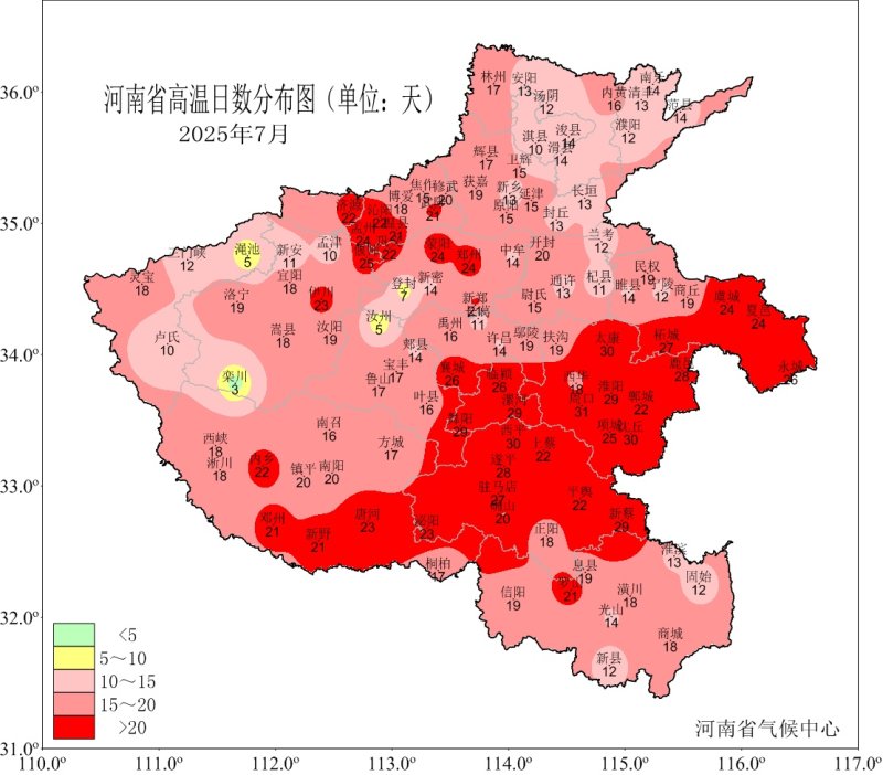 7月,河南省出现大范围持续高温天气,全省平均高温日数18.3天,较常年同期偏多11.9天,为1961年以来同期最多,甚至超过历史年平均高温日数;全省绝大部分地区月高温日数在10天以上,其中豫东、豫中、豫南大部及豫北西部和豫西局部在20天以上,周口站达31天。周口、漯河、驻马店、商丘等地9站连续高温日数达15~31天(周口),突破历史极值。7月15日,全省111个县(区)最高气温超过40℃,洛阳偃师区喂北站最高气温达44.4℃。