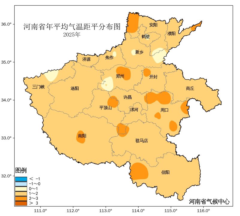 2025年河南省年平均气温距平分布图(单位:℃)。