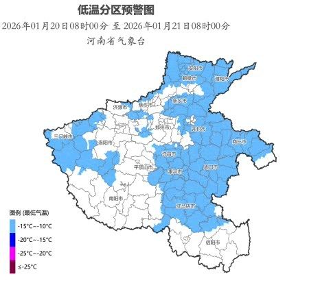 河南省气象台2026年1月19日11时00分发布低温蓝色预警:预计20日凌晨,黄河以北大部、三门峡、洛阳南部、郑州东部和南部、开封、商丘、周口北部、许昌、漯河、平顶山东南部部分县(市、区)最低气温降至零下12℃到零下10℃。
