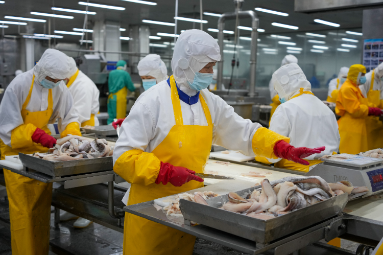 工作人员在荣成泰祥食品股份有限公司生产车间加工鳕鱼(2025年5月28日摄)。
