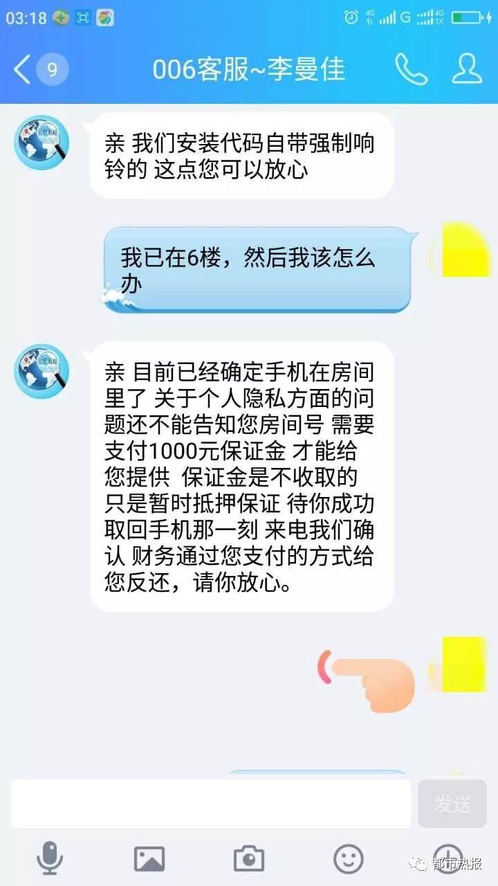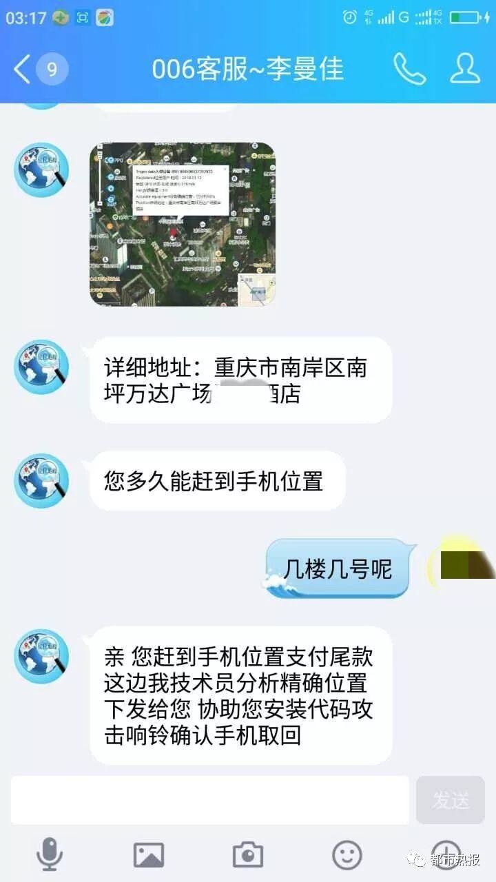 对方收到钱后称技术人员正在处理,10~15分钟后便可定位成功,并且精确度可达到2米内,随后刘璐就收到了对方发来的一张地图截图。客服称,手机目前在万达广场附近的一酒店内。刘璐立即赶到酒店楼下,当问对方怎么确认具体楼层和房间。对方说,在6楼,但为了保护隐私,需要再付1000元保证金,通过激活手机响铃找到手机。