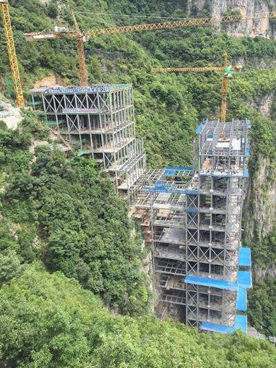 30日上午,采访团一行来到神女景区南环线,在黄岩景区,从山顶乘坐观光索道抵达净坛峰观景平台 ,平台对面就是神女天梯忙碌的施工现场,只见在悬崖峭壁上,神女天梯已初具雏形,采用全钢结构,像一条巨龙从山脊延伸到深不见底的谷底。