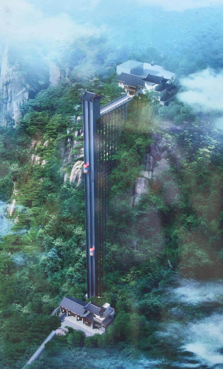 税华介绍,神女天梯是一部垂直观光电梯,全挂式垂直高度达222米,被誉为“世界第一梯”,总投资1.6亿元,于2016年开工建设,采用两部高速电梯双向运行,每秒运行速度4米,每部电梯载重1600千克,乘坐21人。