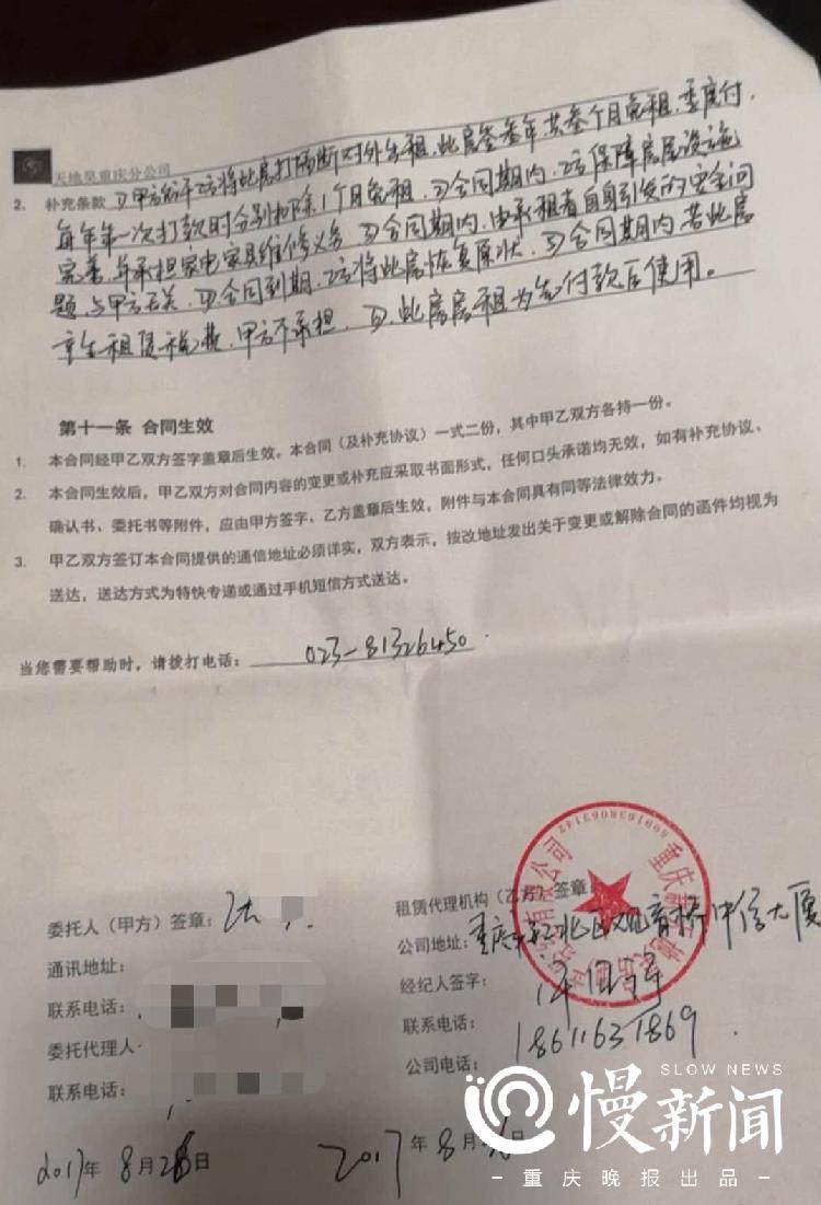 记者在张女士与中介签署的合同上发现,租赁代理机构印章显示为重庆新天地昊房地产经纪有限公司。
