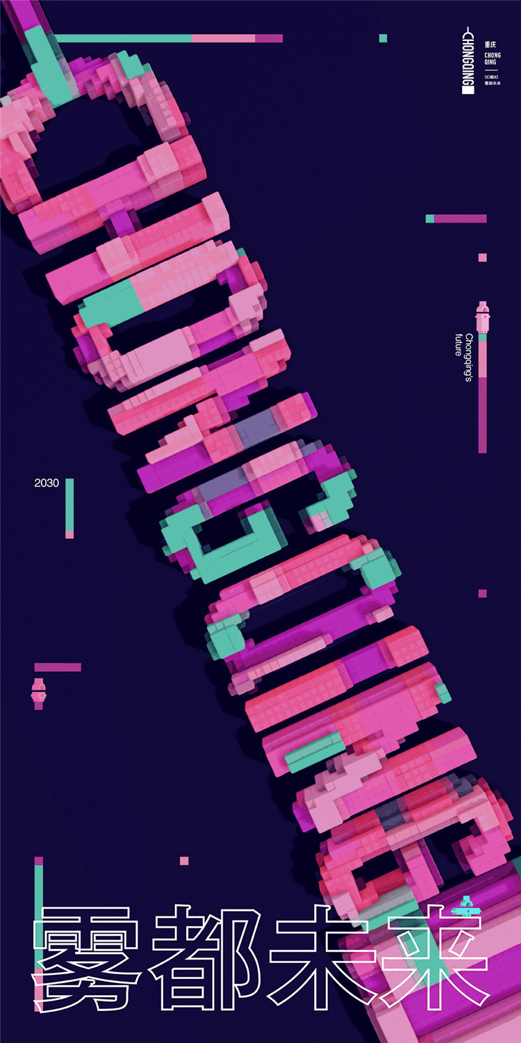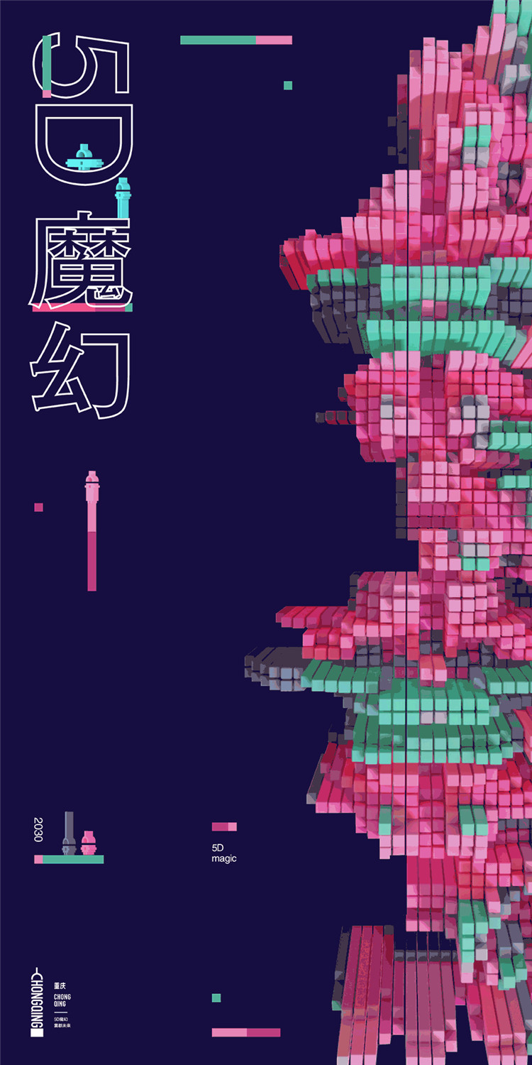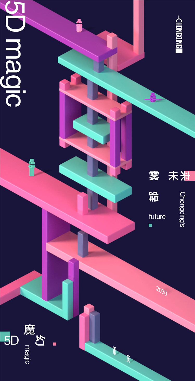 重庆的城市结构彼此堆叠,在城市这个母体里面,人就像分子颗粒,彼此紧密,但又分散……在他们的这组设计中,几张海报从视觉上呈现出城市建筑与人的抽象感,城市结构的未来感,还融入了代表未来科技与创新的雾都小机器人,由此呈现出了一个5D魔幻的重庆城。