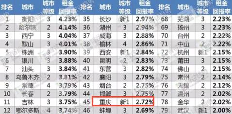 数据显示,衡阳、哈尔滨、西宁、鞍山位居前4名,租金回报率在4%以上。相对而言,北上广深四个城市中,北京的租金回报率最低,以1.37%在百城里排名第96位,深圳是1.38%,上海是1.48%,广州是1.69%。重庆在100个城市中位于中游,排在第45位,租金回报率为2.72%,南京、苏州、青岛、天津等城市的数据也都远远低于重庆。