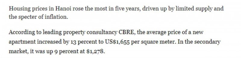 据商业地产咨询公司世邦魏理仕(CBRE)公布的市场报告,今年一季度,河内一级市场公寓的平均价格约为1655美元(约合人民币10920元)/平方米,同比上涨13%;在二级市场,平均售价为1278美元(约合人民币8432元)/平方米,同比上涨9%。