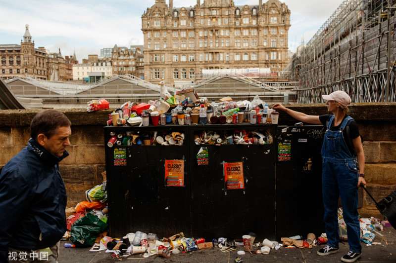 当地时间2022年8月25日,英国爱丁堡,议会工作人员继续罢工,街道上堆满了垃圾。人民视觉 资料图