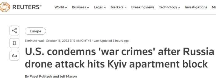 俄军对基辅建筑发起无人机攻击后,美国谴责俄“战争罪行”。图片来源:路透社报道截图