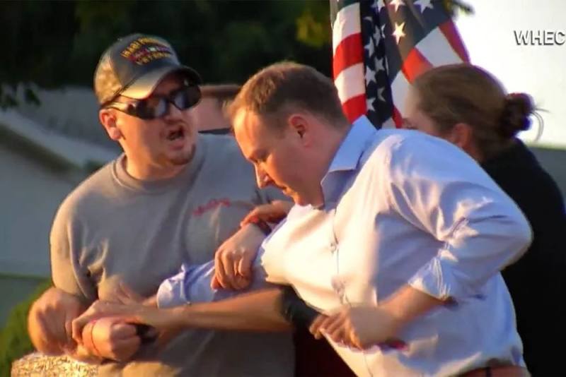7月,纽约州州长候选人李•泽尔丁在一次竞选活动中遭到袭击,一名手持锋利武器的男子向他冲过来,所幸并未得逞。