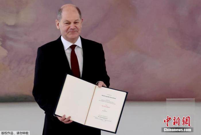 资料图:当地时间2021年12月8日,德国联邦议院正式选举社民党总理候选人朔尔茨为新一届德国总理。图为朔尔茨在总统府接受德国总统施泰因迈尔颁发的总理委任状。