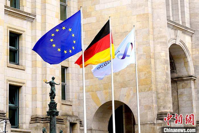 资料图:当地时间2020年7月1日,德国柏林,德国国会大厦前从左到右依次挂出代表欧盟、德国和德国担任欧盟轮值主席国的三面旗帜。 中新社记者 彭大伟 摄