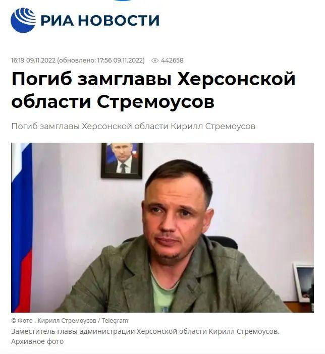 - 据俄媒报道,赫尔松副州长斯特列穆索夫9日在一场车祸中去世。斯特列穆索夫1976年出生于顿涅斯克地区,毕业于西乌克兰国立大学。今年以来,他成为俄罗斯控制的赫尔松州领导人之一,并于9月28日领取了俄罗斯联邦公民护照。