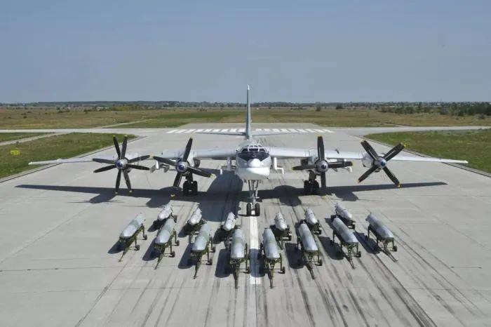 俄一架图-95MS轰炸机前摆放着14枚导弹。图片来源:俄罗斯国防部