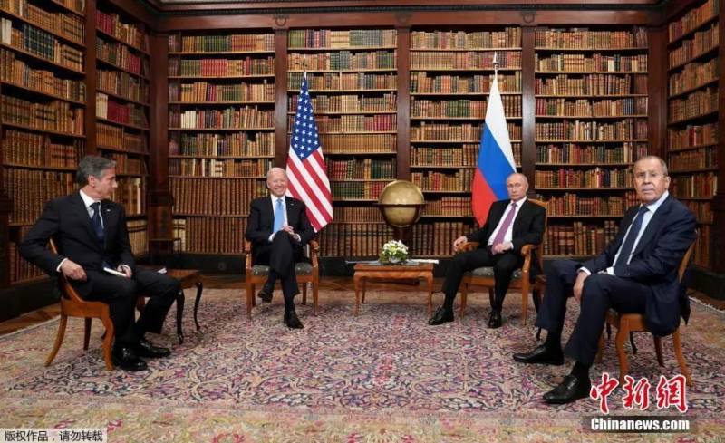 资料图:当地时间2021年6月16日,拜登、普京及美国务卿布林肯、俄外长拉夫罗夫在瑞士日内瓦举行会晤。