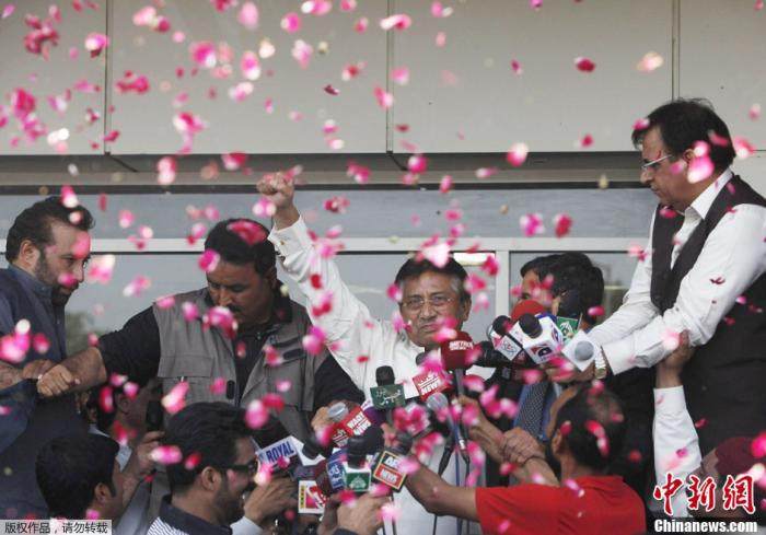 资料图:当地时间2013年3月24日,在辞去巴基斯坦总统职务并离开国家4年多之后,穆沙拉夫当日乘飞机从迪拜抵达巴基斯坦卡拉奇。