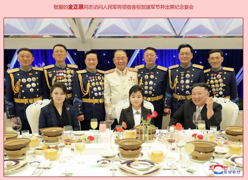 更引人注目的是,在前一天出席建军75周年的纪念宴会时,朝中社发布的多张照片显示,“金主爱”坐在了宴会主桌的“C位”,金正恩和妻子李雪主则分别坐在左右两侧,三人背后站着一排胸前挂满勋章的朝鲜高级将领。