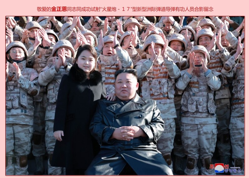 去年11月27日,金正恩会见在“火星炮-17”试射中作出卓越贡献的科学家、技术人员、机关干部等,并与他们合影留念。随后发布的照片中,“金主爱”再次出现,与士兵握手或与父亲交谈。