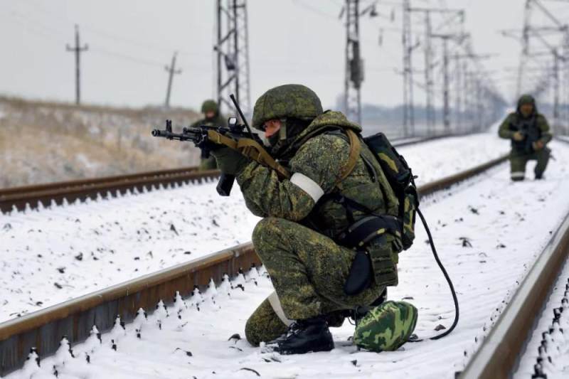 1月30日,俄罗斯铁路部队的士兵在一处铁路轨道执行排雷。图/视觉中国