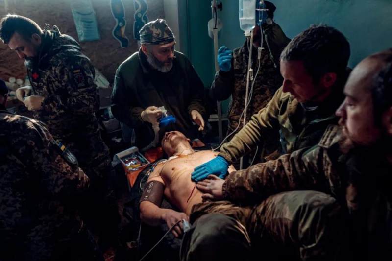 2022年12月25日,顿涅茨克地区巴赫穆特,乌克兰军队医护人员在顿巴斯前线治疗受伤士兵。图/视觉中国