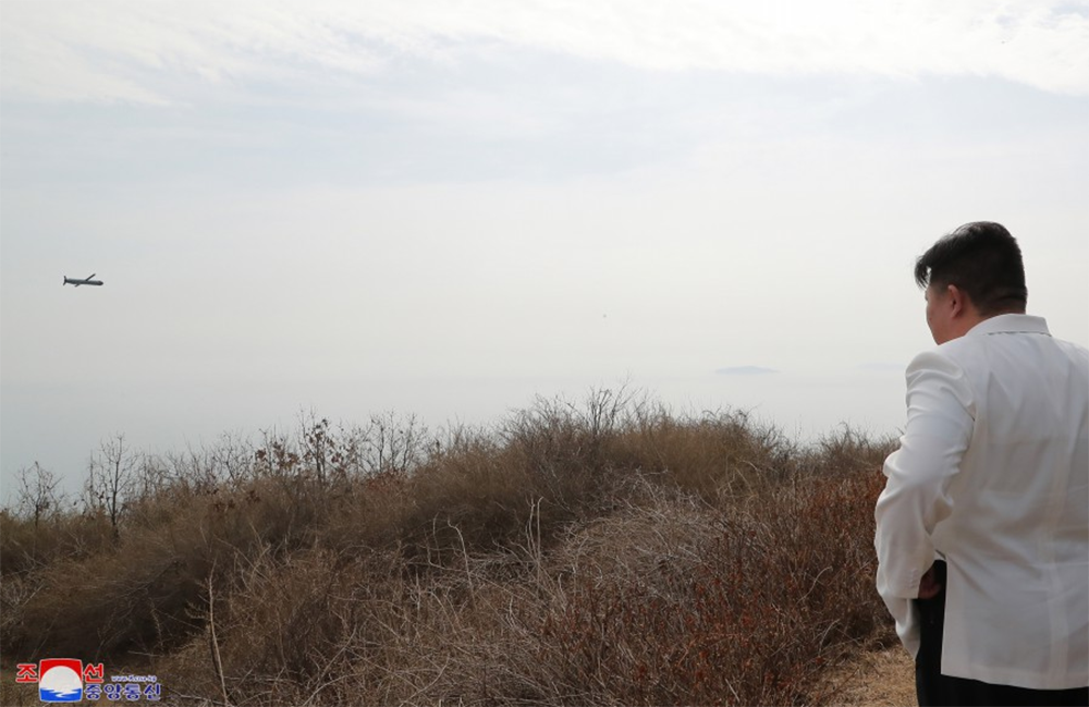 金正恩近距离观看巡航导弹低空飞行。