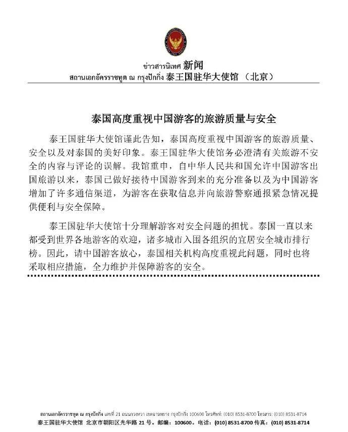 泰国驻华大使馆还强调,“泰王国驻华大使馆十分理解游客对安全问题的担忧。泰国一直以来都受到世界各地游客的欢迎,诸多城市入围各组织的宜居安全城市排行榜。因此,请中国游客放心,泰国相关机构高度重视此问题,同时也将采取相应措施,全力维护并保障游客的安全。”
