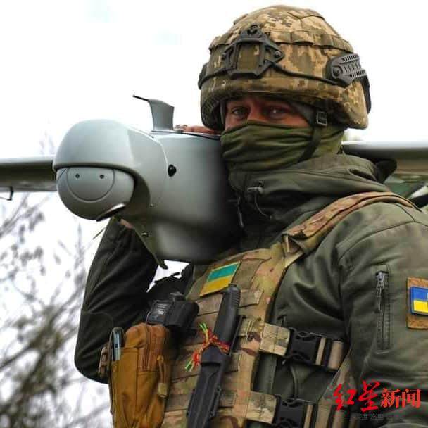 ↑一名肩扛无人机的乌军士兵