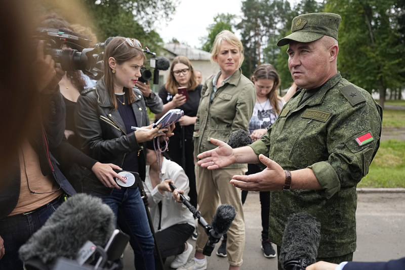 当地时间2023年7月7日,白俄罗斯国防部长助理Leonid Kosinsky少将在营地接受采访。