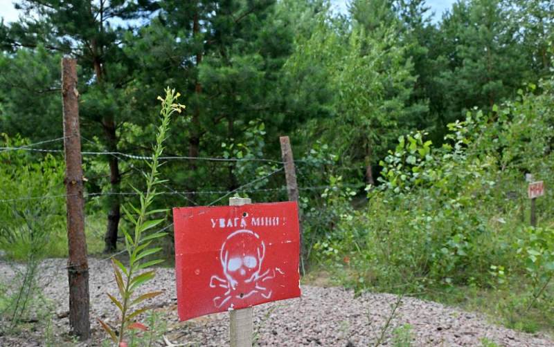 当地时间2023年7月14日,乌克兰切尔尼耶夫地区,乌克兰-白俄罗斯边境的斯拉夫蒂奇检查站,写着“注意地雷”的标牌。
