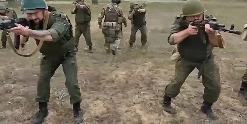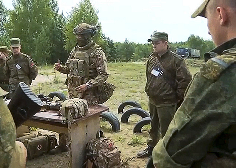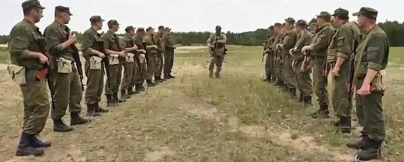 当地时间2023年7月14日,白俄罗斯明斯克,瓦格纳集团一名教官对白俄罗斯士兵进行训练。(视频截图)