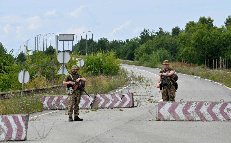 当地时间2023年7月14日,乌克兰切尔尼耶夫地区,乌克兰边防警卫在乌克兰-白俄罗斯边境的斯拉夫蒂奇检查站巡逻。