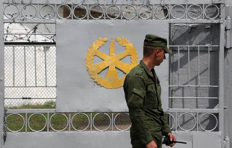当地时间2023年7月7日,白俄罗斯阿西波维奇,一名白俄罗斯士兵在新营地的入口处站岗。
