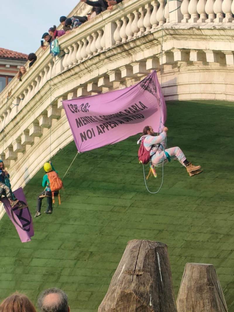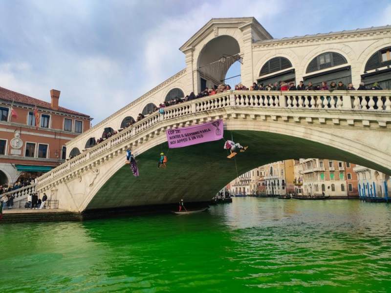 抗议者当天还在威尼斯里亚托桥上悬挂横幅,上面写着“COP28:政府高谈阔论,我们命悬一线”。“反抗灭绝”组织声称,向运河投放的是一种无害的荧光素,河水会在几小时后恢复原状。
