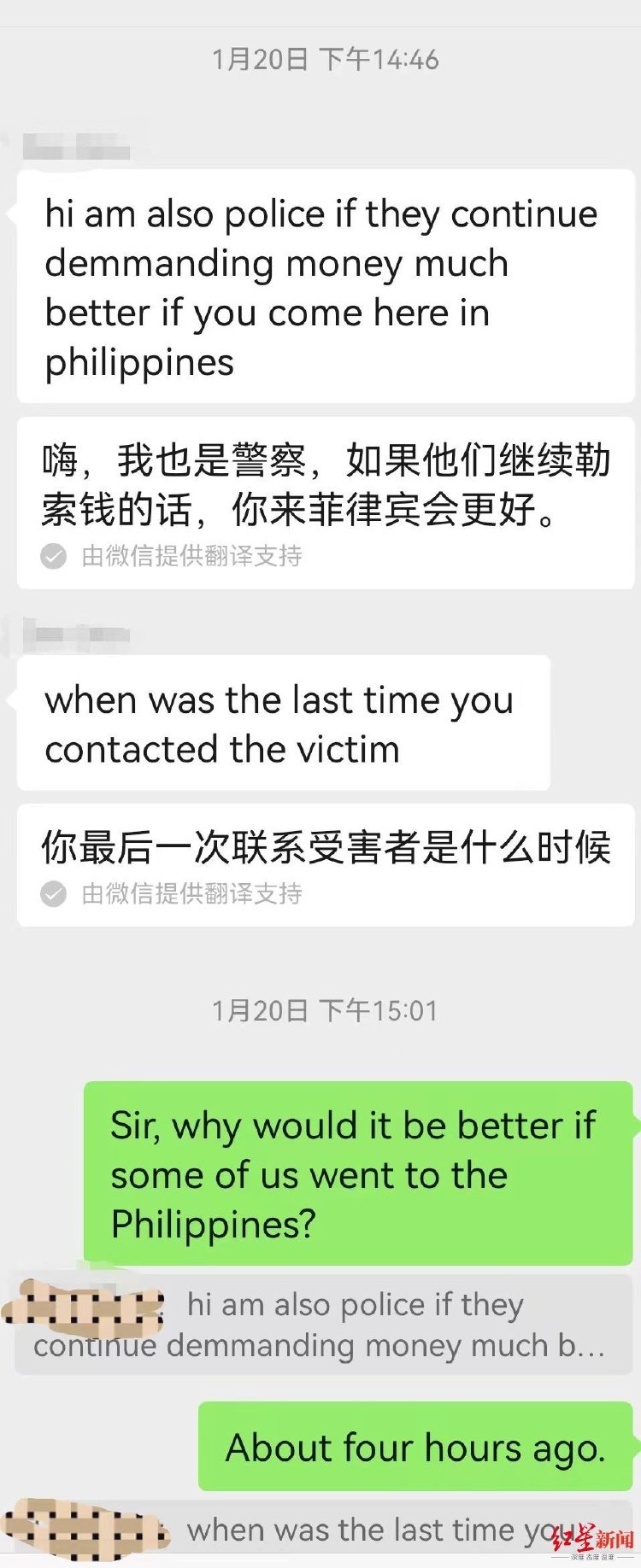 1月20日(周六)上午, 几名菲律宾警察联系小凡询问被绑架人员信息。当地警察希望家属来菲律宾报警,并建议不要给绑匪打钱。当时,小凡不敢完全相信当地警察,没与对方沟通太多,而家人也坚决反对他去菲律宾报警。