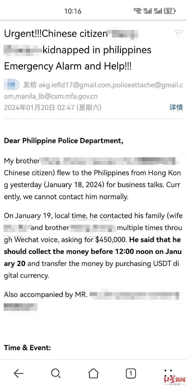 在承诺去筹钱并保持沟通的同时,小凡第一时间联系了大使馆,并在大使馆工作人员建议下给菲律宾警方反绑架大队(AKG)发了求助邮件。
