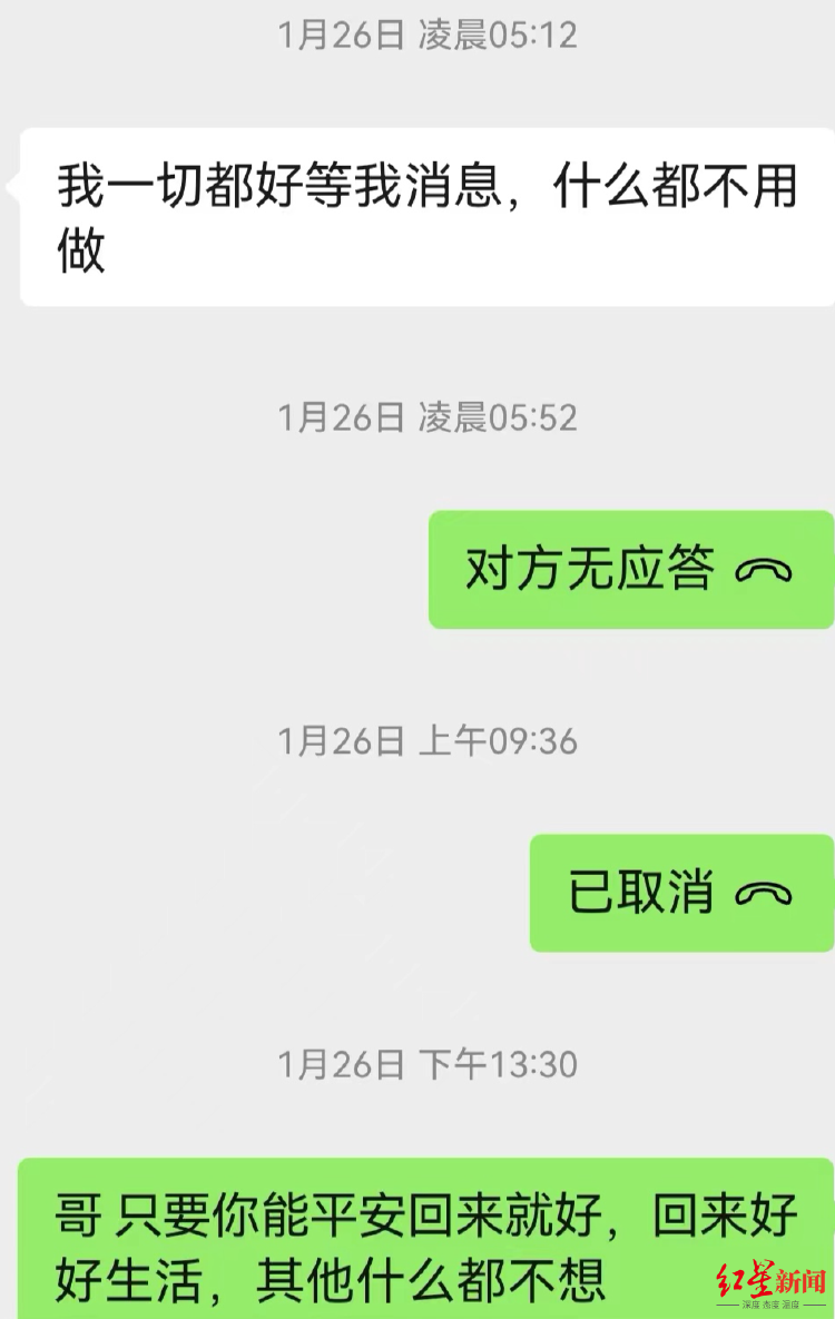 直到1月26日周五早上五点十二分,哥哥发来一句“一切都好,等我消息,什么都不用做”之后,小凡再也没能跟哥哥联系上了。