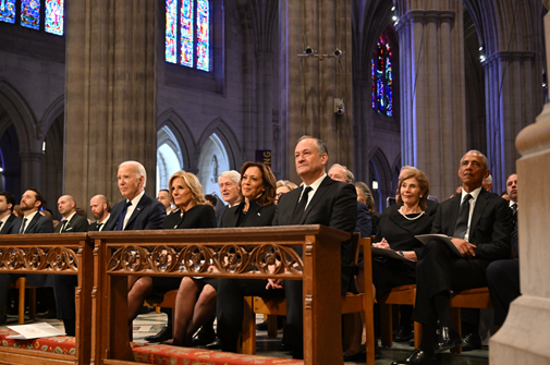 1月9日,五任美国总统齐聚卡特葬礼。图源:美媒第一排从左到右为:拜登、拜登夫人吉尔·拜登、哈里斯、哈里斯丈夫道格拉斯·埃姆霍夫;第二排从左到右为:克林顿、克林顿夫人希拉里、小布什、小布什夫人劳拉·布什、奥巴马、特朗普、特朗普夫人梅拉尼娅。