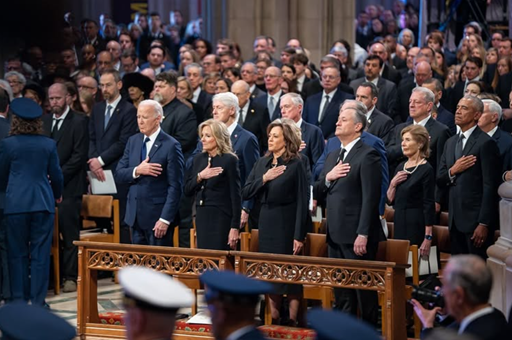 《纽约时报》提到,卡特中心周四(9日)也在社交媒体X上分享了葬礼现场的不同照片,拍摄角度较低,显示了出席者的座位布局,前排清晰可见拜登、哈里斯及其配偶。第二排则分别为克林顿、小布什的夫人劳拉·布什和奥巴马。希拉里·克林顿和小布什被略微遮挡,而特朗普夫妻则完全未出现在画面中。