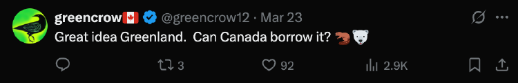 有网友说,“格陵兰岛的主意真不错。加拿大可以借用吗?”↓