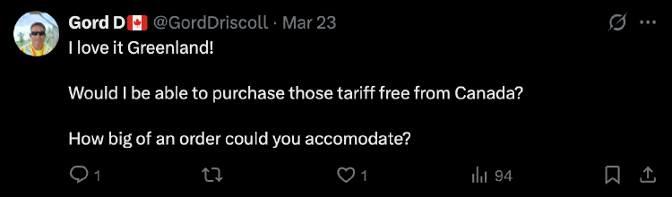 还有网友表示,“我很喜欢格陵兰岛!我能从加拿大免税购买这些吗?你们能接受多大的订单?”↓