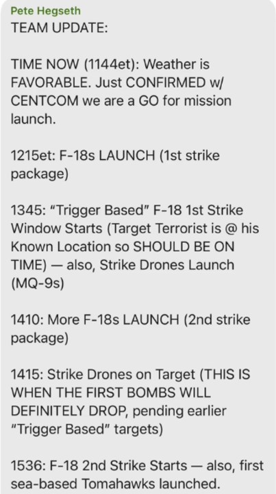 美国《大西洋》月刊总编辑戈德堡发布的赫格塞思在群聊中上传的美军作战计划截图。