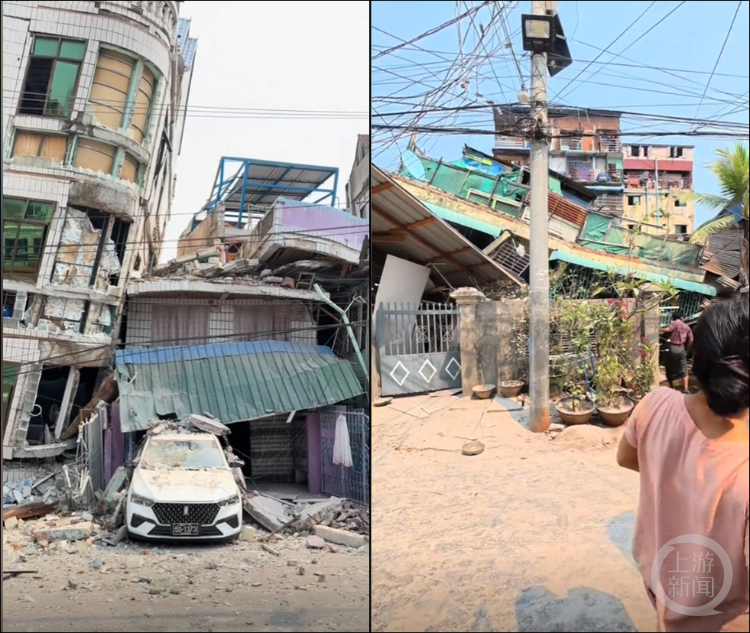上游新闻记者看到,黎艺夕3月28日下午发布的视频显示,当时地面摇晃很严重,他和一名缅甸人手拉手相互搀扶才避免摔倒。他在3月29日更新了多个视频,这些视频显示当地街道房屋垮塌很严重,还有妇女钻进垮塌的楼道缝隙,弯腰安慰被埋在废墟里的女儿。“好多人都没了,我没有去拍那些场景。”他说。