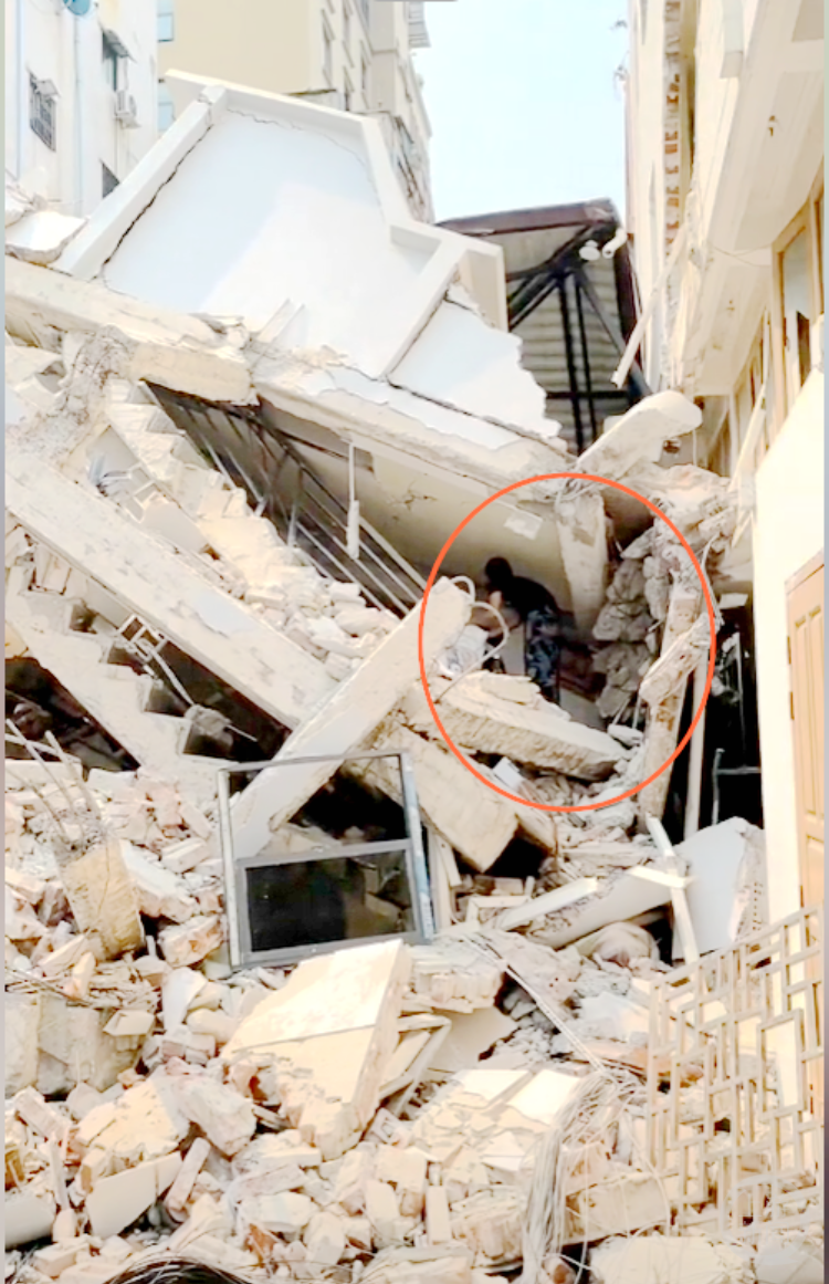 一个妈妈从楼栋缝隙安慰被埋在废墟的女儿。 受访者供图