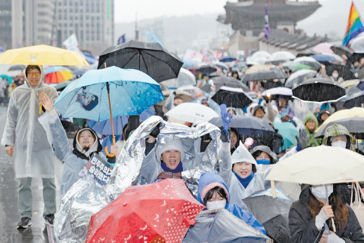 4月5日,韩国首尔,部分市民冒雨在光化门集会,庆祝尹锡悦被罢免总统职务,并要求对他进一步追责。(法新社)