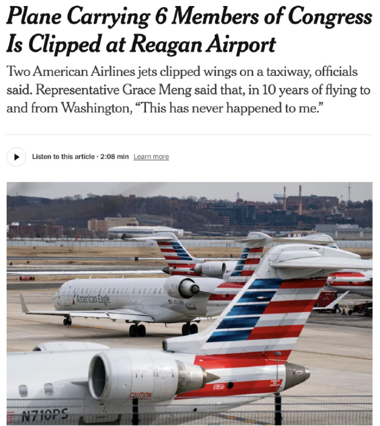 @环球时报消息,据《纽约时报》10日报道,据美航及相关官员消息,当地时间周四,两架美国航空公司客机在华盛顿特区里根国家机场滑行道上发生碰撞,其中一架飞机上载有来自纽约和新泽西州的至少六名联邦众议员。