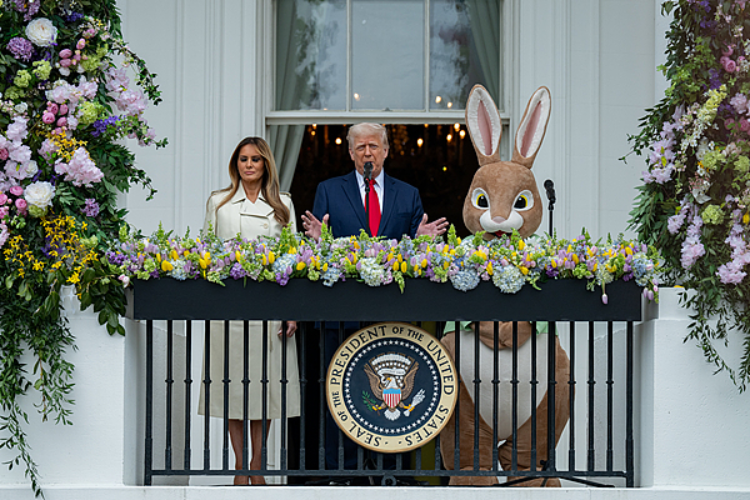 4月21日复活节期间,白宫热闹非凡,特朗普夫妇与一只巨大的“复活节兔子”共同亮相,大量儿童和他们的父母在白宫花园参加拥有近150年历史的传统活动“复活节滚彩蛋”:孩子们用一个长柄勺推动鸡蛋在草地上滚动。