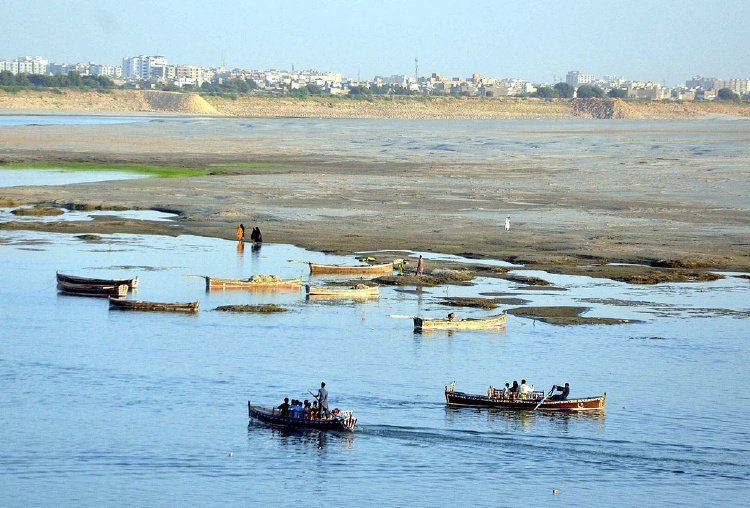 当地时间2025年4月24日,巴基斯坦海德拉巴,库特里水坝附近的印度河干涸,水位下降,显示出未来缺水的高风险。视觉中国 图