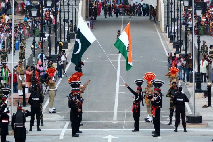 2019年8月14日,在巴基斯坦东部拉合尔附近与印度交界的瓦格赫口岸,巴基斯坦(前)和印度两国的仪仗兵参加降旗仪式。新华社发